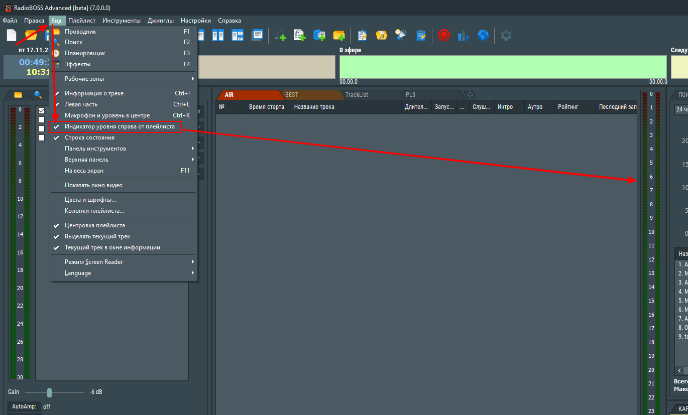 • VU-метр может быть размещен в правой части окна плейлиста