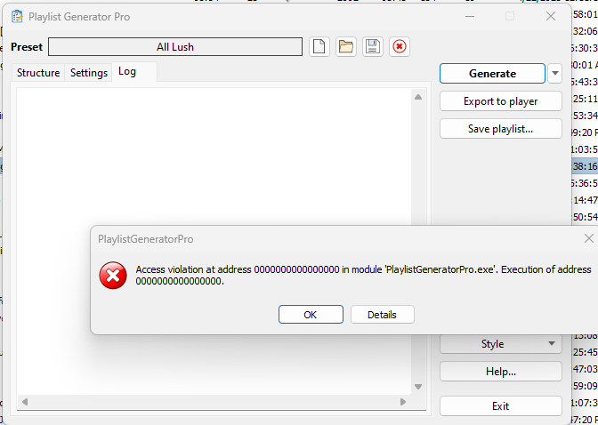 I also got an error message when clicking exit. This same error message appeared when I clicked "Generate" (RadioBOSS 7.0.1.4)